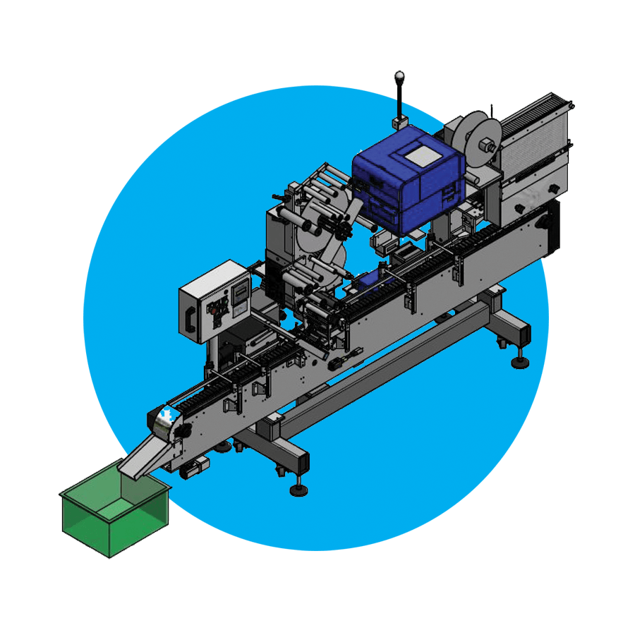 T & B systems are designed to apply “c-wrap” labels, bottom only labels, or top & bottom labels simultaneously. There are three system types that include split belts, interrupted belts, and hugger (side) belt labeling systems. The type of system chosen, is based on the relationship, or size between the product’s contact surface and bottom label. Depending on the label position and product shape, the label can be wiped on or tamped on. The SL1500 and SL2000 can wipe on or merge a label with the motion of the product, or the L60 Tamp or UPA II Printer Applicator can contact the product with the label whether fully in motion or not.